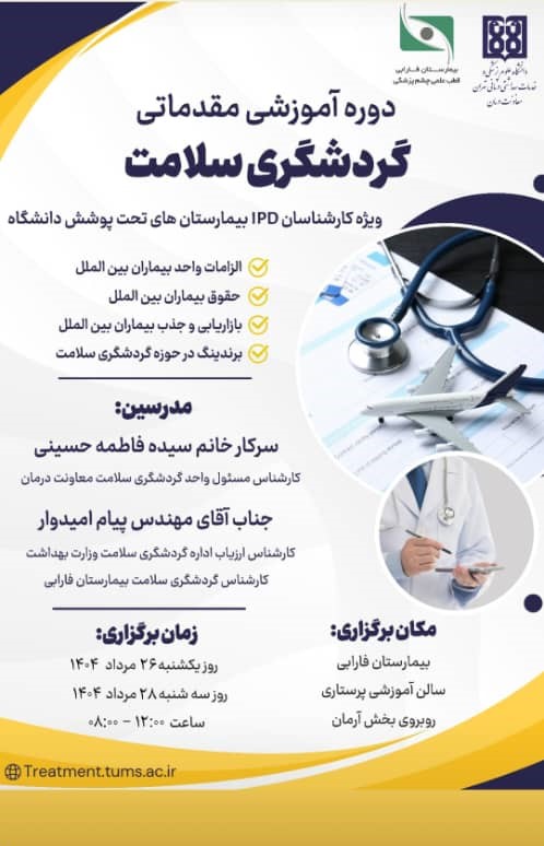 توضیح اینکه دومین روز دوره مقدماتی گردشگری سلامت، روز سه شنبه 28 مرداد 1404 در بیمارستان فارابی برگزار خواهد شد.