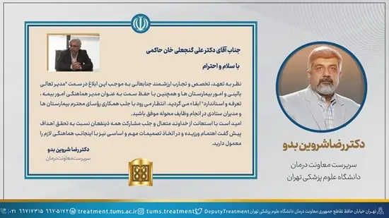 به گزارش روابط عمومی دانشگاه علوم پزشکی تهران معاونت درمان، دکتر رضا شروین بدو، سرپرست معاونت درمان در حکمی دکتر علی گنجعلی خان حاکمی را به سمت مدیر تعالی بالینی و امور بیمارستان ها و مدیر هماهنگی امور بیمه، تعرفه و استاندارد دانشگاه ابقاء کرد.