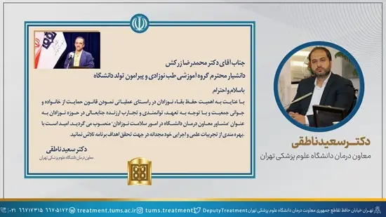 با عنایت به اهمیت حفظ بقاء نوزادان در راستای عملیاتی نمودن قانون حمایت از خانواده و جوانی جمعیت و با توجه به تعهد، توانمندی و تجارب ارزنده جنابعالی در حوزه نوزادان به عنوان "مشاور معاون درمان دانشگاه در امور سلامت نوزادان" منصوب می گردید.