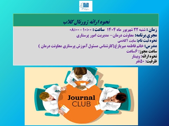 وبینار آموزشی "نحوه ارائه ژورنال کلاب" در روز شنبه 22 شهریور 1404در سالن اجتماعات معاونت درمان برگزار خواهد شد.