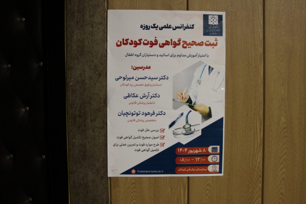 به گزارش روابط عمومی معاونت درمان دانشگاه علوم پزشکی تهران، مدیریت امور پرستاری معاونت درمان دانشگاه کنفرانس علمی یک‌روزه با موضوع ثبت صحیح گواهی فوت کودکان را با هدف تعیین علت دقیق موارد مرگ و میر اطفال در روز ‌شنبه ۸ شهریور ۱۴۰۴ با تدریس دکتر سیدحسین میرلوحی، استادیار و فوق تخصص ریه کودکان، دکتر آرش عکاظی، دانشیار پزشکی قانونی و دکتر فرهود توتونچیان، متخصص پزشکی قانونی و با حضور فاطمه پولادی، کارشناس بررسی مرگ کودکان 1 تا 59 ماهه معاونت درمان در سالن امید بیمارستان مرکز طبی کودکان برگزار کرد.