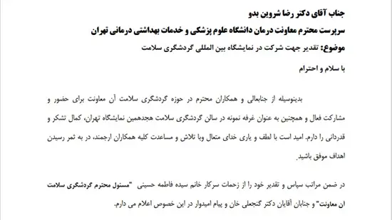 بدینوسیله از جنابعالی و همکاران محترم در حوزه گردشگری سلامت آن معاونت برای حضور و مشارکت فعال و همچنین به عنوان غرفه نمونه در سالن گردشگری سلامت هجدهمین نمایشگاه بین المللی گردشگری و صنایع وابسته تهران، کمال تشکر و قدردانی را دارم. امید است با لطف و یاری خدای متعال و با تلاش و مساعدت کلیه همکاران ارجمند، در به ثمر رسیدن اهداف موفق باشید.