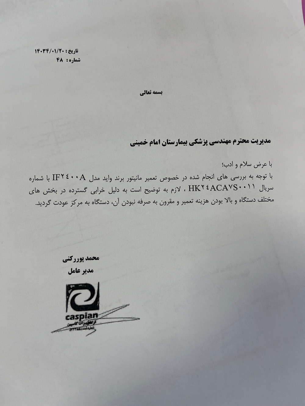 طبق نامه شماره  48 مورخ 20/01/1404 شرکت نمایندگی با توجه به مقرون به صرفه نبودن و غیرقابل تعمیر بودن  مانیتور  اسقاط می باشند.